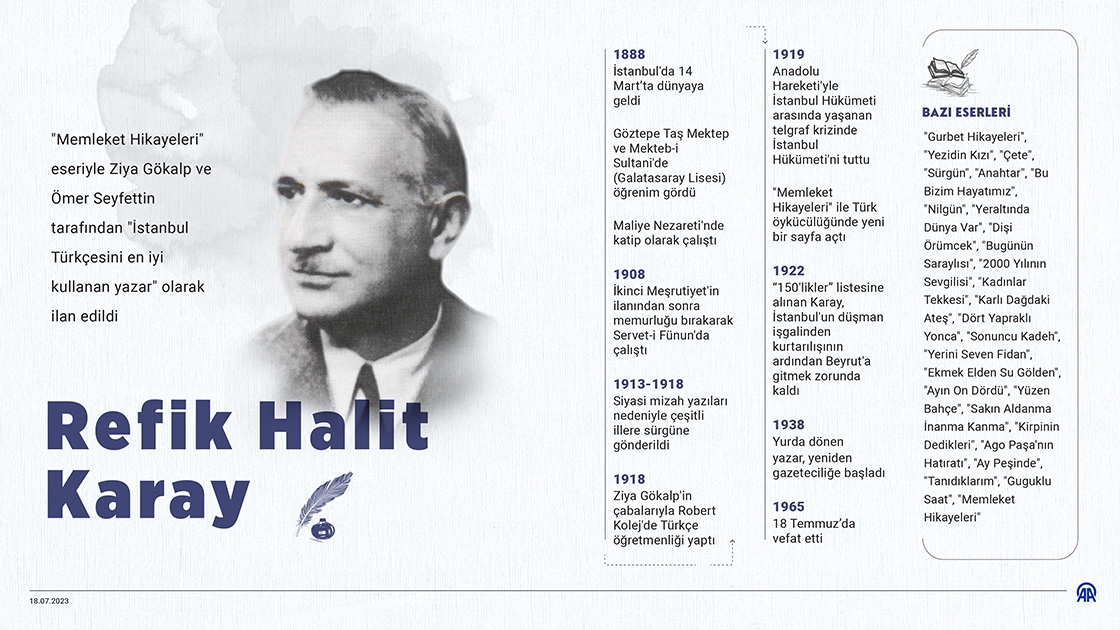 Türk edebiyatının önde gelen isimlerinden romancı, öykü yazarı ve gazeteci Refik Halit Karay, vefatının 58. yılında anılıyor.
